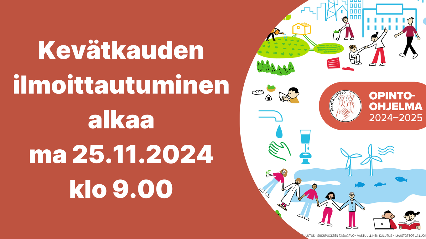 Julkaistu 20.11.2024 Muokattu 20.11.2024Kianta-Opiston kevätlukukauden kursseille voi ilmoittautua ma 25.11.2024 klo 9.00 alkaen.