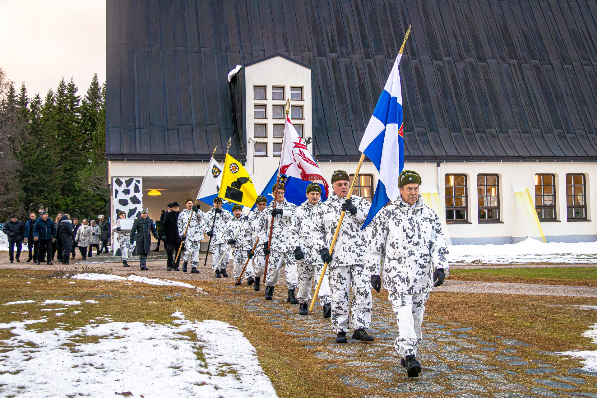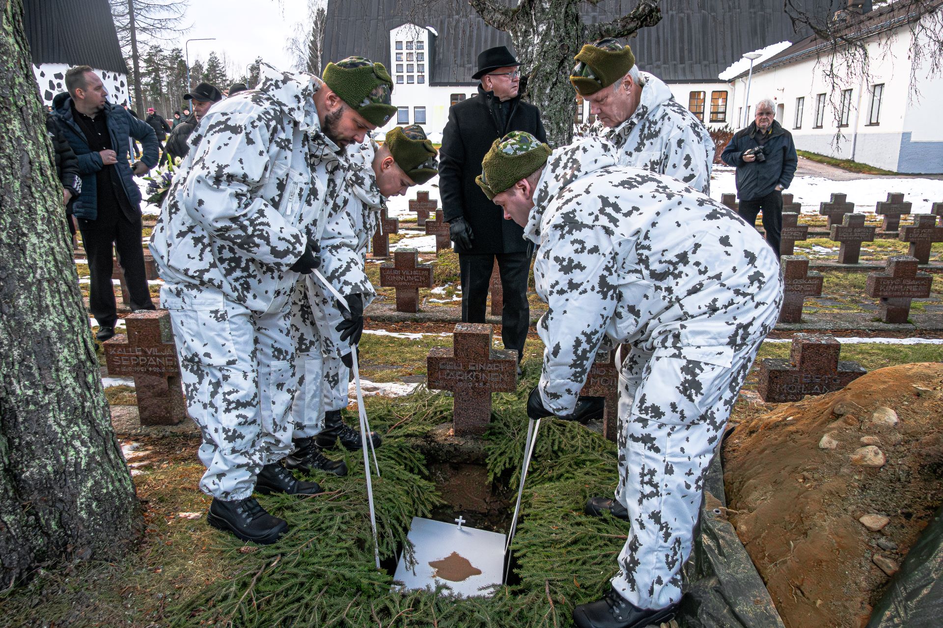 Kainuun prikaati järjesti siunaustilaisuuteen Suomen valtiollisen lipun, kirkkoupseerin, arkunkantajan, kunniavartion, seppeleenlaskijat ja kunnialaukausten ampujat.