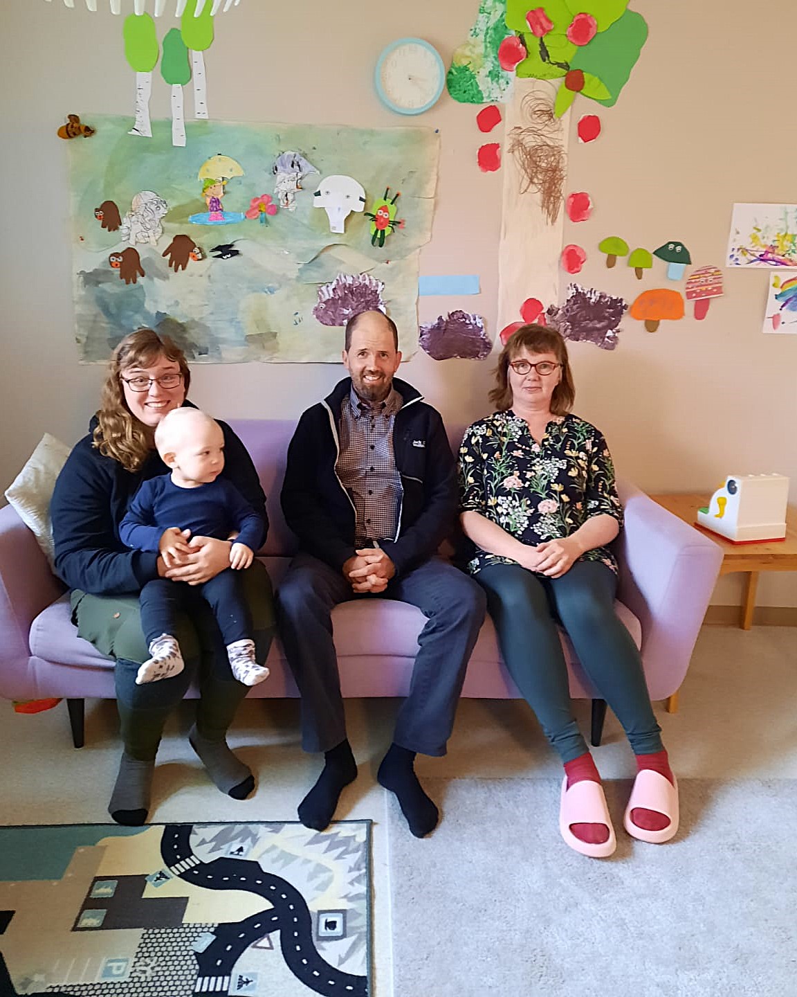 Sohvakuvassa kyläyhdistyksen puheenjohtaja Darja Korhonen nuorimmaisensa kanssa, sivistysjohtaja Teemu Piirainen ja varhaiskasvatuksen lastenhoitaja Maarit Kuvaja. Toisessa kuvassa tuliaisiksi tuotujen autojen kanssa leikkii varhaiskasvatuksen johtaja Jaana Heikkinen.