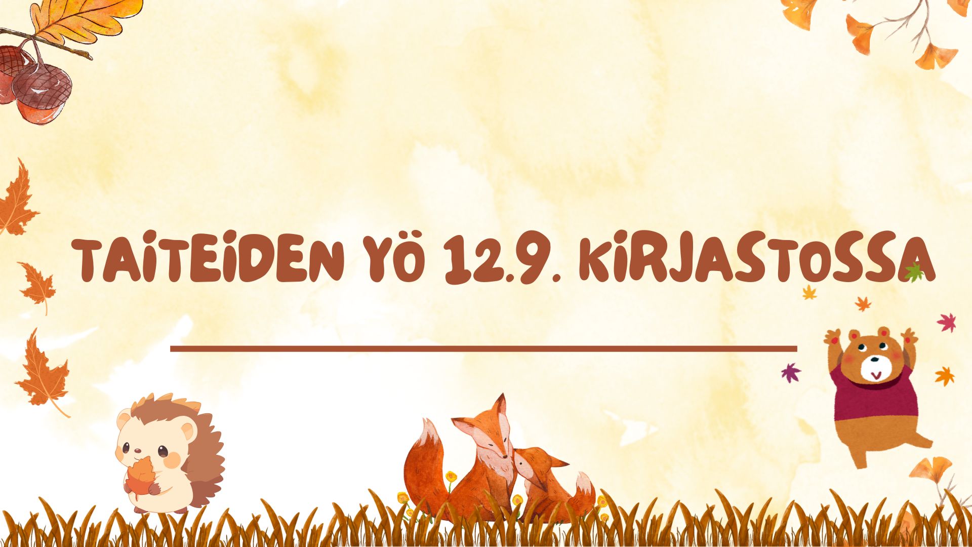 9.9.2025 Taiteiden yö 12.9.2025 kirjastollaPääkirjasto on avoinna Taiteiden yönä klo 10-21. Kirjasto myy poistokirjoja tarjoushintaan ja Galleria Kiepissä on Suomen ympäristökeskuksen valokuvanäyttely Tunturihaukan silmin. Illan aikana on yhteistyökumppaneiden kanssa järjestettyä ohjelmaa. Mukana ovat Kainuun lasten- ja nuortenkulttuurikeskus, Kulttura, Kennelliitto ja Suomussalmen Kalevalaiset.