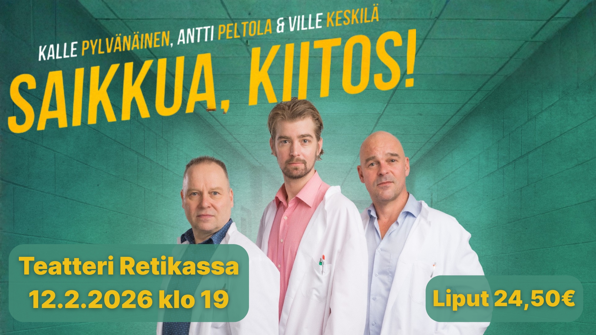 Saikkua, kiitos!Ismo Leikolan ja Kalle Pylvänäisen käsikirjoittama terveysaiheinen komedia on naurattanut suomalaisia jo vuodesta 2013. Esityksessä käsitellään tuttuja teemoja – terveyskeskuksia, lääkäreitä ja potilaita – hulvattomien hahmojen kautta. Näyttämöllä loistavat Ville Keskilä, Kalle Pylvänäinen ja Antti Peltola. Varaa kulttuuripassipaikkasi sähköpostitse tai puhelimitse kuhunkin esitykseen tekstiviestitse tai sähköpostilla. Paikkoja on rajatusti.